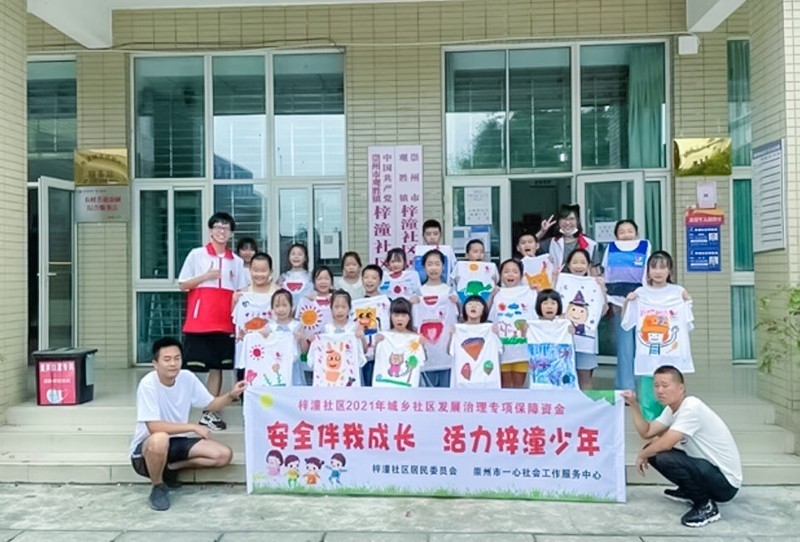 体验完崇州市社区安全屋,8月19日下午,社工带领小朋友绘制未来“安全伴我成长 活力梓潼少年”安全教育营会的营服,希望大家通过营服的绘制,更认同“集体”的概念。小朋友们充分发挥了自己的想象力,有的在衣服上绘制了海绵宝宝;有的用了大面积色彩并写上了自己喜欢的英文单词,还有一对双胞胎姐妹,同时在衣服上绘制了美好家园的形象等等。大家分享完作品,讲出想法后,集体拿着作品进行了合照。
