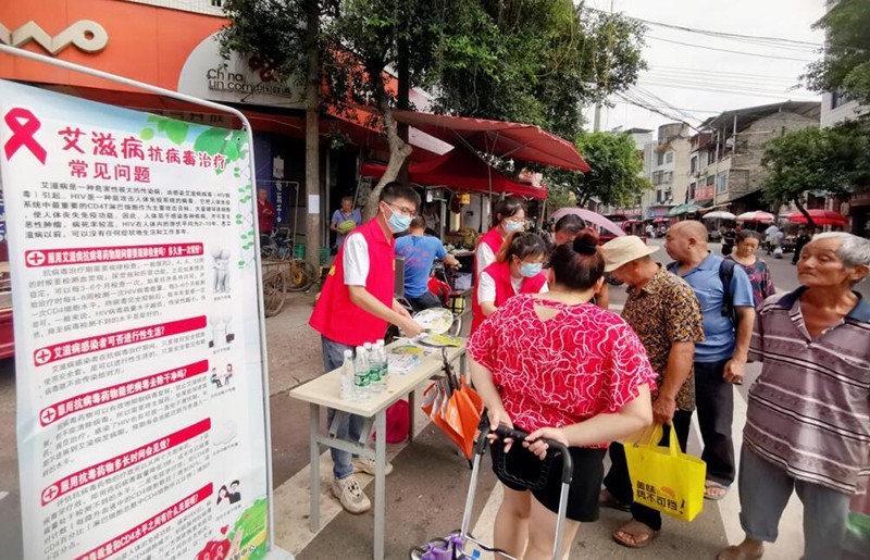 熙熙攘攘的赶场居民,琳琅满目的商品,烟火气息浓郁。8月19日上午,位于四川省南充市高坪区东观镇“关爱驿站”艾滋病防治宣传咨询及健康知识普及站点正在开展“乡村红丝带·防艾有我在”艾滋病防治知识主题宣传活动。