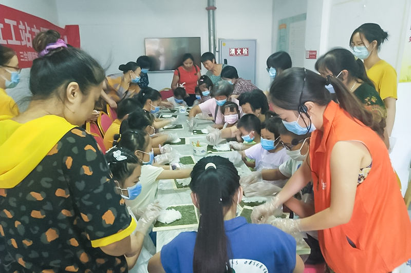 小朋友期待的寿司制作主题开始了,社工老师详细讲解了寿司制作怎样使用工具以及寿司制作的要领。孩子们睁着大大的眼睛盯着老师,生怕没有听明白,那副认真的样子仿佛比在学校上课还专注。领到海苔和寿司米后,小朋友们一丝不苟动起手来,俨然一副寿司小达人的模样。卷寿司是一个力气活,有些年龄较小的参与者便求助家长和老师的帮助。