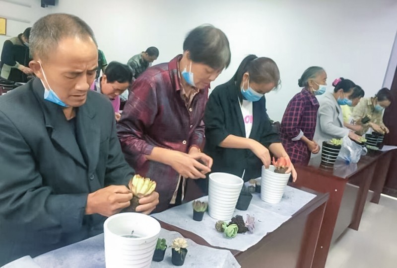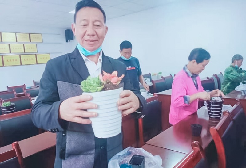 然后社工为大家分享了多肉配盆技巧,小小的多肉,根据不同的搭配能够呈现出不同的造型。分享完毕后社工邀请在场村民现场种植多肉,每个村民都精心挑选着自己喜欢的多肉品种,从选苗、培土、移盆、打理,每个步骤他们都十分认真。不一会儿一盆盆漂亮的多肉呈现在我们眼前,现场氛围其乐融融,热闹非凡。