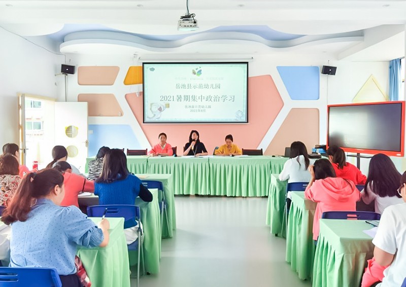 为教育引导广大师生增强“四个意识”,坚定“四个自信”,做到“两个维护”,不忘立德树人初心牢记为党育人,为国育才使命,切实提升幼儿园教师思想政治素质和师德师风水平,努力建设一支德高艺技的教师队伍。按照上级文件精神,结合幼儿园实际情况,8月25日—29日,四川省广安市岳池县示范幼儿园组织了为期5天的暑假集中政治学习。