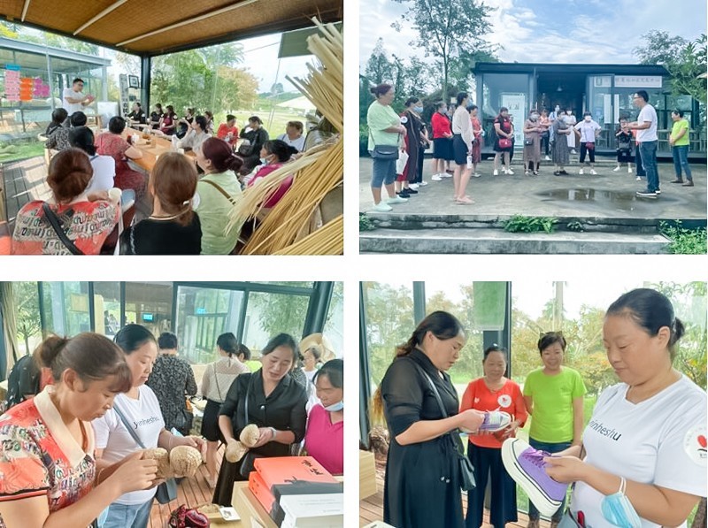 崇州一心根据白头镇四村一社区妇女实际情况及需求:甘泉村如何挖掘拥军文化、五星村如何利用旅游资源创业增收、三洞村发动妇女参与社区活动等。设计了“乡村姐妹筑梦公益游学 箭塔村妇女创业小组交流”活动,活动围绕与箭塔村妇女互助小组(烘焙坊、戏剧工作室、蒲草编织、书香屋等妇女创业者)进行交流,了解每个妇女团队创业的经历、遇到的困难、对自己未来的规划等,同时针对未来想要申请凤尾兰基金微项目的团队与箭塔村妇女创业小组相似的项目进行一对一沟通交流。2021年9月2日,在成都吾乡乡创的支持下,崇州一心组织白头镇四村一社区乡村姐妹20余人前往蒲江县甘溪镇箭塔村开展“乡村姐妹游学”、“乡村姐妹的能量”主题沙龙讨论。