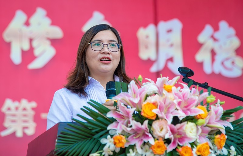 近年来,该校的教学质量不断提高,德育特色更加彰显,管理工作有新举措,教学科研有新发展,规范办学上新台阶......这一切的实现,离不开我们可亲可敬的老师们,教师代表康芮登台激情发言。