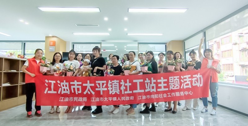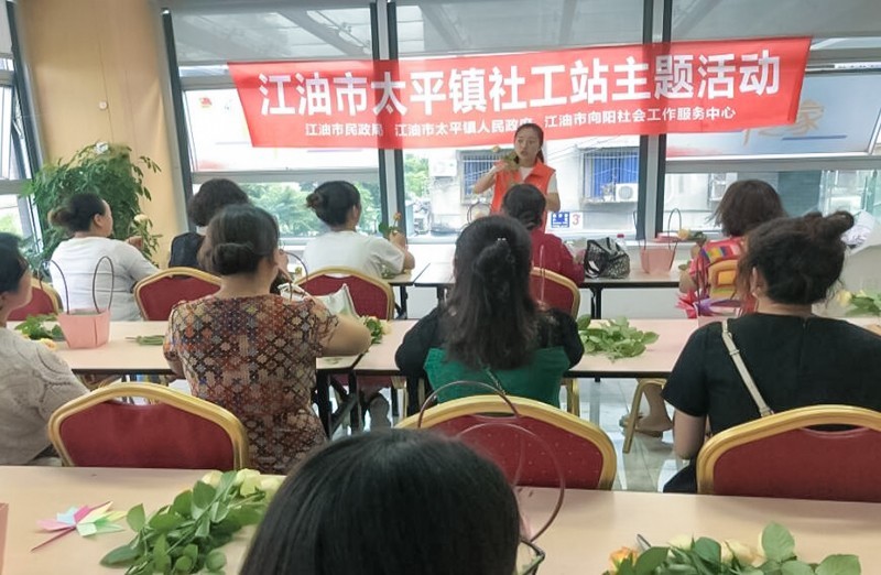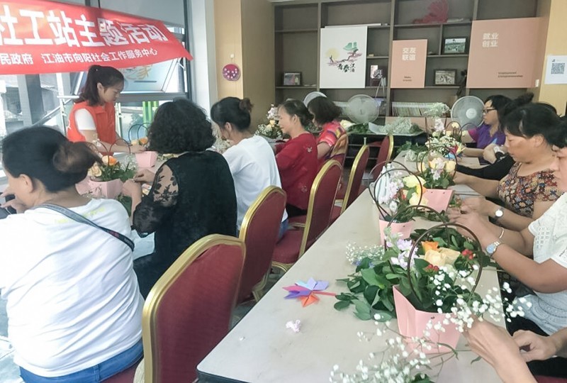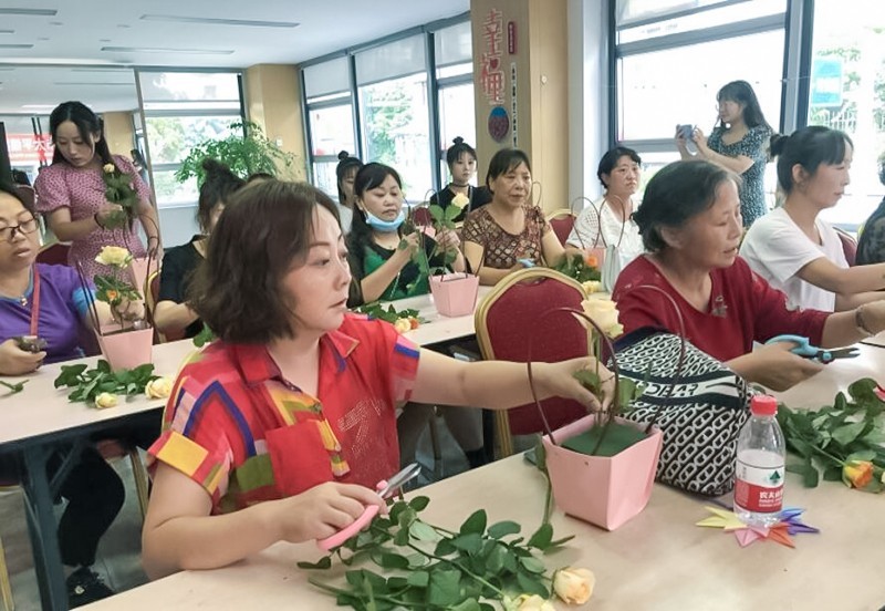 9月9日,四川省江油市太平镇文风社区15位阿姨兴高采烈来到社区活动室,参加江油市向阳社会工作服务中心与文风社区居委会联合举办的“花”点时间 享受生活插花主题活动。