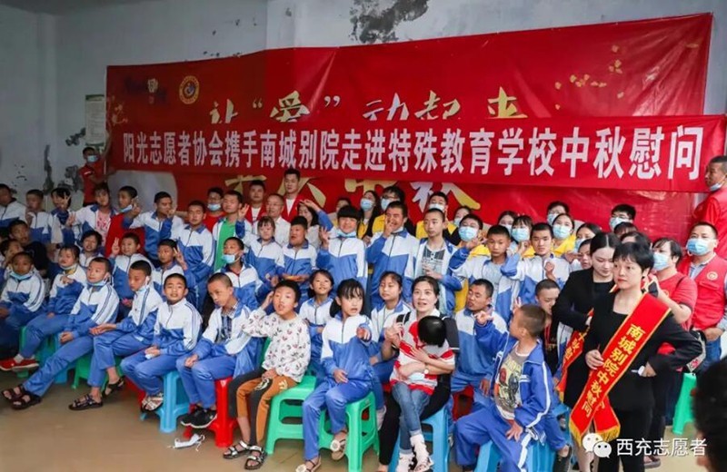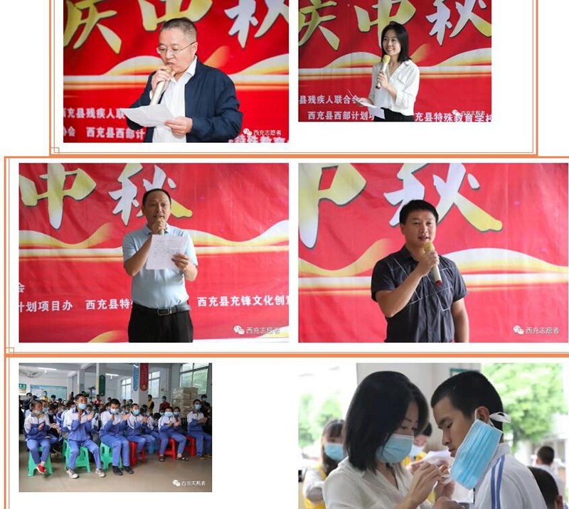 9月18日,中秋节前夕,由共青团西充县委、县残联指导,西充县阳光志愿者协会、西充县西部计划项目办携手赞助商嘉源伟业开发的南城别院别墅、爱心企业主办的“让爱动起来 共庆中秋”慰问活动走进该县特殊教育学校,为学校送来学习用品、学生秋装、月饼、纸巾等爱心物资,与特殊儿童们一起包饺子、吃月饼,分蛋糕,一片其乐融融。