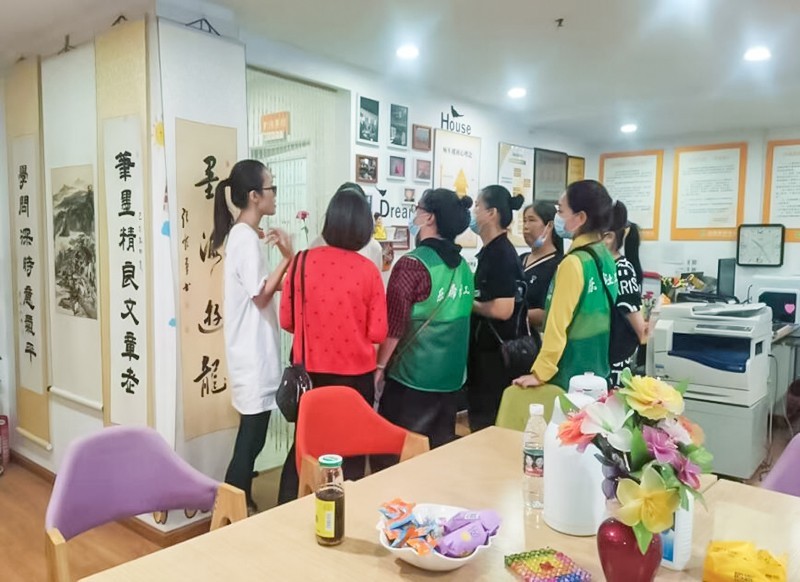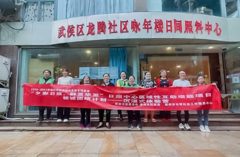 经过前期互助体系的建立,各日间照料中心工作人员主动参与的积极性增强了,对于活动的策划也有了一定的了解,但对于日照中心的整体持续性发展还不是很清楚,为了提升日间照料中心工作人员服务老人的能力,增强与同行相互交流学习的机会,学习优秀团队的先进理念。9月13日——17日,乐帮社工带领6个日间照料中心的阿姨们到成都武侯区龙腾社区咏年楼日间照料中心参与沉浸式体验学习先进的经验。
