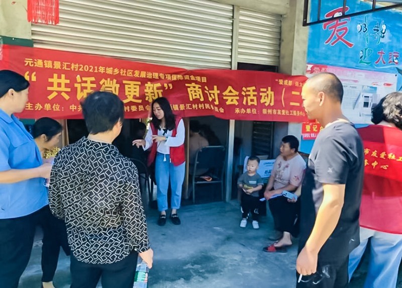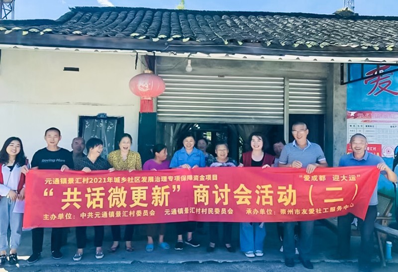 9月28日下午,由四川省崇州市元通镇景汇村村民委员会主办,崇州市友爱社工服务中心承办的“共话微更新”商讨会(二)在尹家湾一组小广场上顺利开展,参加此次活动的村民共计20余人。