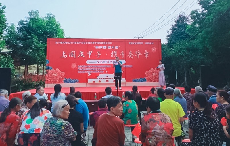 为营造良好节日氛围,为庆祝新中国成立72周年华诞,激发社区居民的爱国情怀,弘扬民族精神。在“国庆”来临之际,9月30日,由四川省崇州市街子镇凤鸣村村民委员会主办,崇州市友爱社工服务中心承办“与国庆甲子·携手奏华章”文艺汇演活动在凤鸣村村民委员会顺利开展。