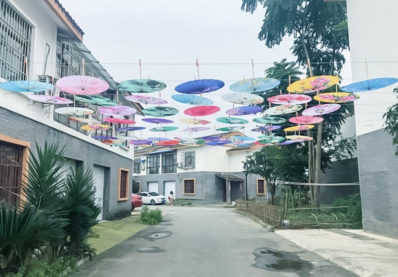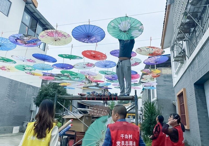 为进一步落实千功一期家园环境美化工作,提高公共空间使用效能,激发村民参与环境整治内生动力。10月以来,千功一期第一片区基础美化工作已经开始进行,目前,绿化带外围植物栅栏已经定型,并于10月8日下午,四川省崇州市隆兴镇千功村两委组织志愿者和社工在千功一期第一片区内开展小区形象提升工程--悬挂油纸伞。