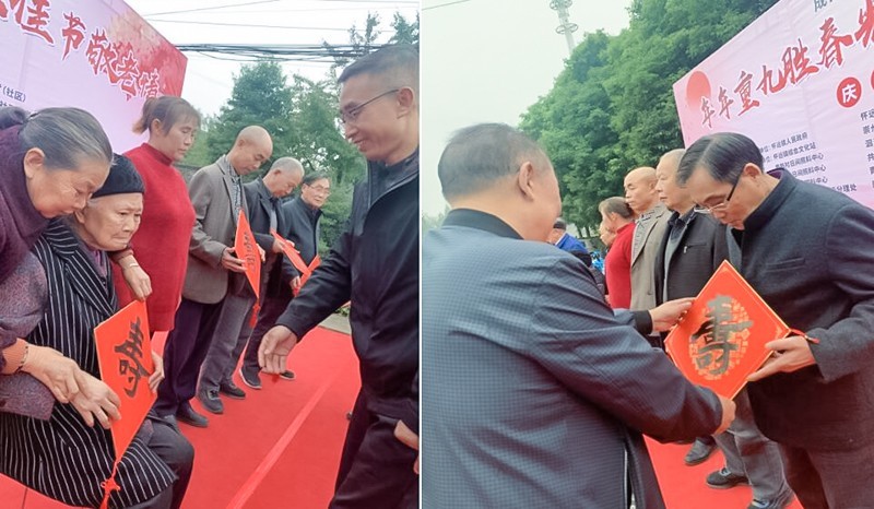 节目中也邀请日间照料中心辖区内的10位老人代表,一位来自洄澜街社区的老人谭静英今年已是高寿101岁,书法老师为现场的老人们书写了“寿”字和“福”字,在重阳节这个特别的日子里祝福老人福气满满、健康长寿,老人们在活动中也表示对党和政府的感谢。