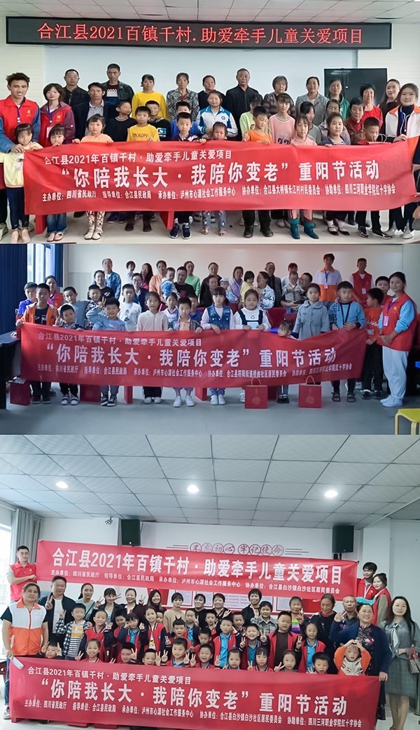 “满园花菊郁金黄”,佳节又重阳。在中国传统节日——重阳节即将到来之际,为弘扬中华传统文化,提升儿童尊老敬老的意识,培养儿童孝敬长辈,关爱家人的优秀品质,由四川省民政厅主办,泸州市合江县民政局指导,合江县符阳街道桥凼社区居民委员会、白沙镇白沙社区居民委员会、大桥镇长江村村民委员会协办、四川三河职业学院红十字协会志愿者协助,泸州市心源社会工作服务中心承办的合江县2021百镇千村·助爱牵手儿童关爱项目“你陪我长大,我陪你变老”重阳节活动分别在桥凼社区、白沙社区、长江村成功开展。
