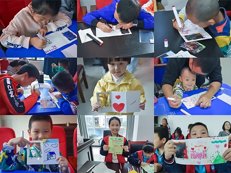 此次活动分为4个环节展开——“重阳知、重阳识”、“卡片绘、心意寄”、“肩肉肉、背按按”、“影响留、祝福送”。活动过程轻松快乐又温馨感人。孩子们在志愿者的循循善诱中知道了重阳节的来历,在同伴们的朗朗诵诗声中了解了重阳节的习俗,在感人至深的悠扬歌声中向家人长辈表白感恩的话语、在天马行空的绘画构思中流露尊老敬老的浓浓情谊。纯真的心感受炙热的爱,稚拙的行动表达真挚的情感。憨态可掬,天真无邪,步履蹒跚,白发苍苍,大手牵着小手,是人间最温暖的画面。孩子欢笑嬉戏忙,老人安康身体健,夕阳童唱心头暖,乐享天伦醉语牵。