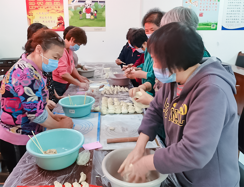 阿姨们各有各的手法,包出的饺子形态各异。饺子包好了,午饭时间也到了。煮饺子时,热腾腾的香气飘了出来,勾起了阿姨们的食欲,品尝着美味的饺子,唠着家常,大家笑得特别开心。