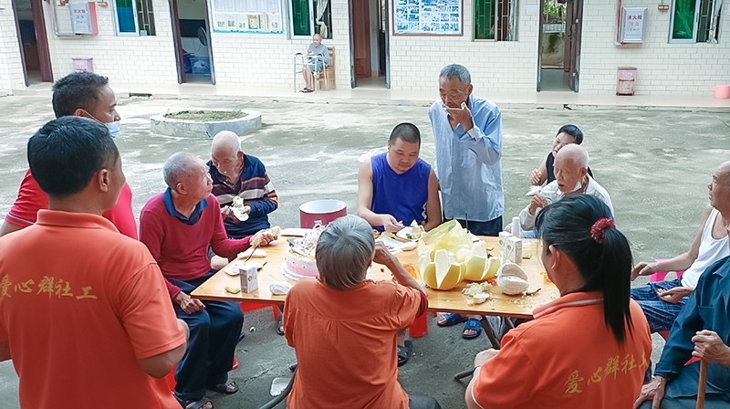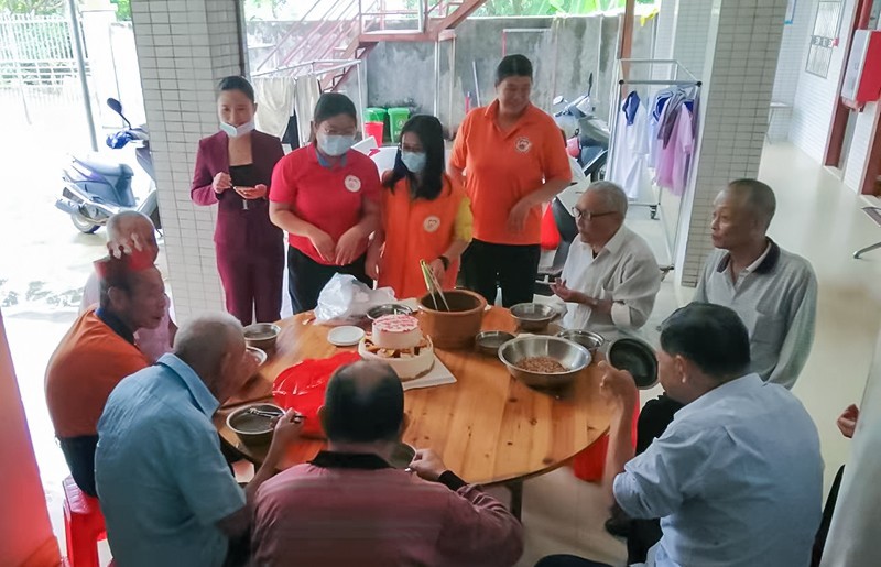 安墩镇、宝口镇、多祝镇、白盆珠镇敬老院社工为老人家精心准备了“水果大餐”,高潭镇敬老院社工为老人家带来了充满回忆的擂茶,老人家在院子内、屋内围坐在一起享用美食,社工向老人们送上节日的问候和衷心的祝愿,现场充满了欢声笑语。