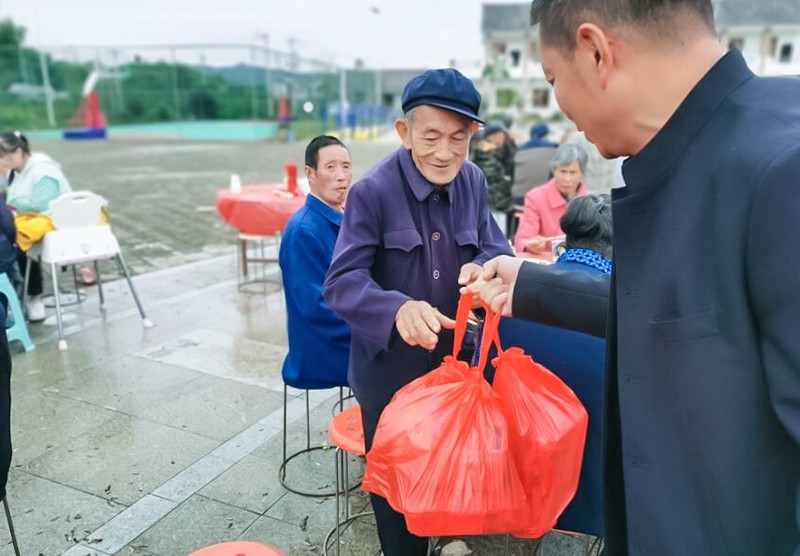 此时秋雨渐停,节目也在掌声雷动中结束。待老人们就座后,热热闹闹的寿宴即将开始。村两委干部齐为80岁以上老人分发慰问品,并祝老人福如东海、寿比南山。