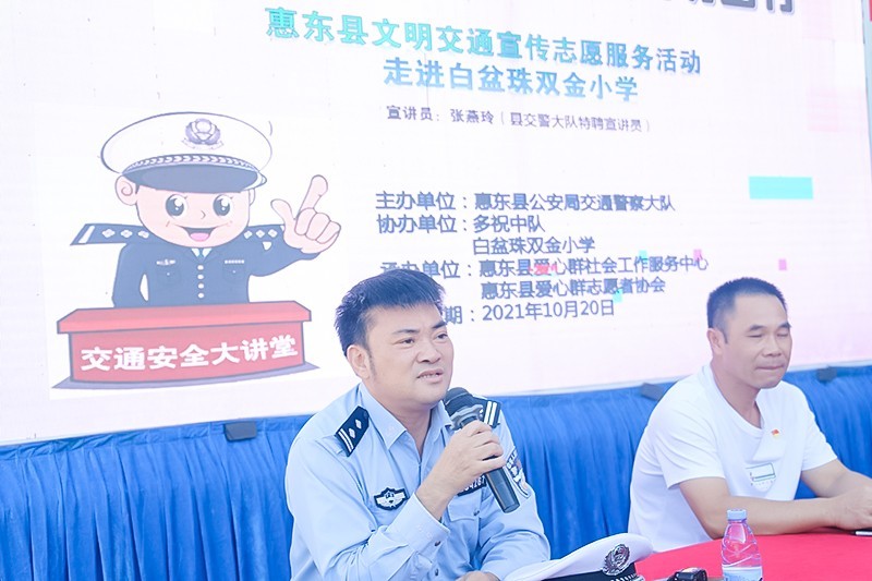 为进一步增强青少年的交通安全意识,养成自觉遵守交通法规的良好习惯。10月20日下午,由广东省惠东县公安局交通警察大队主办,多祝中队、双金小学协办,惠东县爱心群社会工作服务中心承办的“知危险会避险·安全文明出行”惠东县文明交通宣传志愿服务活动走进白盆珠镇双金小学。