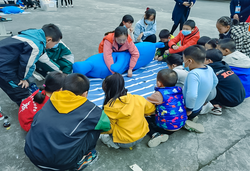 互动性和趣味性很强的“平安小课堂”调动了学生们对课程的参与积极性。完全沉浸在情景中的孩子们合力将“伤员”轻轻放在制作好的毛毯担架下,各自分工后开始进行搬运,当伤员被安置在安全的位置后,孩子们非常有成就感,有的孩子表示自己掌握了这一急救方法,有的孩子感悟到毛毯担架更加考验团队的合作性,而不是个人的力量。