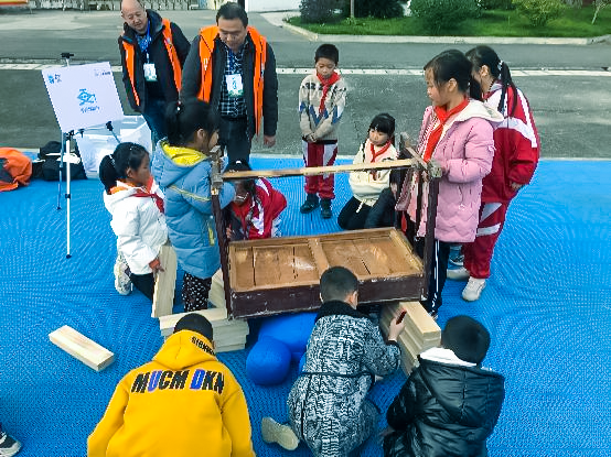校长、老师和全校77位学生对我们的到来翘首以待。我们刚抵达学校,师生们热情地迎了上来,大家齐心协力忙着协助我们将活动器具卸下车来,搬运至学校操场。在所有器具中,有一箱木块是最重的,也是我们几个女士最犯难的,还没等我们动手,全部器具很快就整齐地摆放在操场上。师生们的友善之举,温暖着我们的心,让我们很是感动。