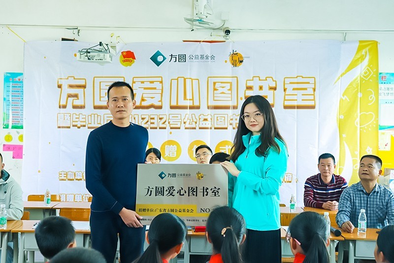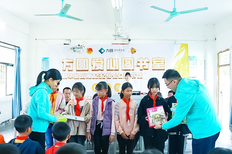 紧接着,广东省方圆公益基金会副理事长兼秘书长徐冬梅、方圆湾区城更集团惠州片区总经理颉昆共同向梁化光长小学学生代表赠送书籍。