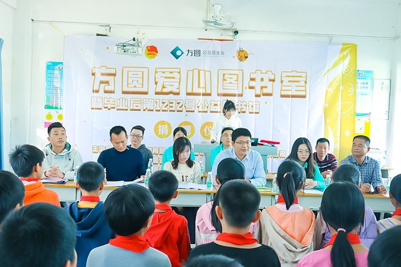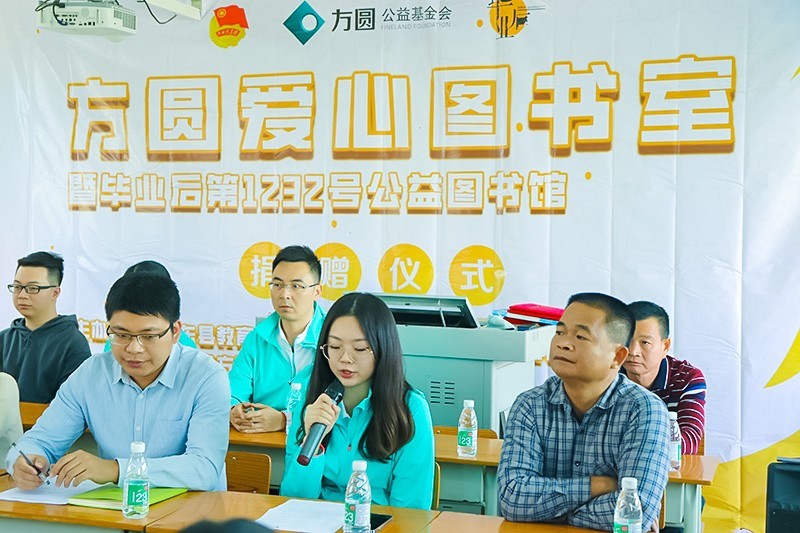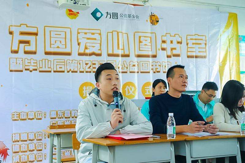 接下来,广东省方圆公益基金会理事长方兴致辞:“一本书的力量,可以影响一个人,一群人乃至一代人的发展。正因如此,我们一直在为省内经济欠发达地区的学校捐建图书室,目前已经在106所小学进行了捐书助学。除了图书室项目,我们也将为8名同学提供‘圆梦助学金’,助力学习梦。相信通过这些项目,能为同学们带来一些成长与改变,让你们插上知识的翅膀,感受书籍的力量,希望同学们接下来用好图书室,爱读书、读好书!”