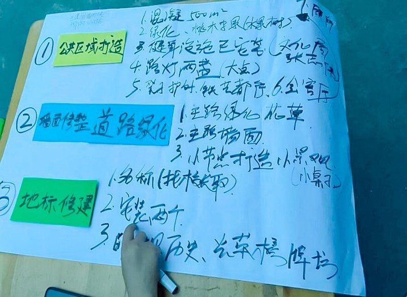 工作人员就林盘打造问题与居民进行了讨论,向居民介绍了公益微创投项目,并提供一些先例供居民参考了解。同时也详细听取了村民关于林盘打造的意见和想法,总结下来林盘打造就在于三个重点:公共区域打造(包括混凝土、绿化、健身器材、路灯、凳子),墙面修整道路绿化(包括主路绿化、墙面、小景观打造),地标修建(包括地标名称、院落历史、居民光荣榜)。在社工的讲解带领下,村民的建设热情高涨,纷纷表达自己的意见和想法,对于村民的相关意见,工作人员也做好了相应的记录,以便以后正式开展林盘打造活动。