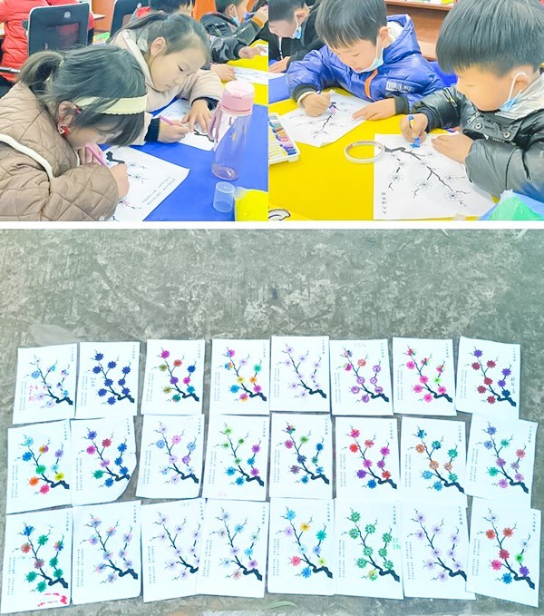 社工介绍,消寒图是在白纸上绘制九枝寒梅,每枝九朵。一枝对应一九,一朵对应一天,每天根据天气实况用特定的颜色填充一朵梅花,直到九九之后春回大地,一幅九九消寒图才算大功告成。在社工的带领下,小朋友们拿着消寒图用自己喜欢的方式给每朵梅花涂色,共迎春暖花开。