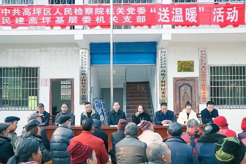 12月24日下午,民建高坪机关支部、高坪区人民检察院捐赠仪式在高庙子村委会召开。高坪区人民检察院检察长罗庆勇主持仪式。民建南充市高坪区基层委主委黄新出席仪式并讲话。