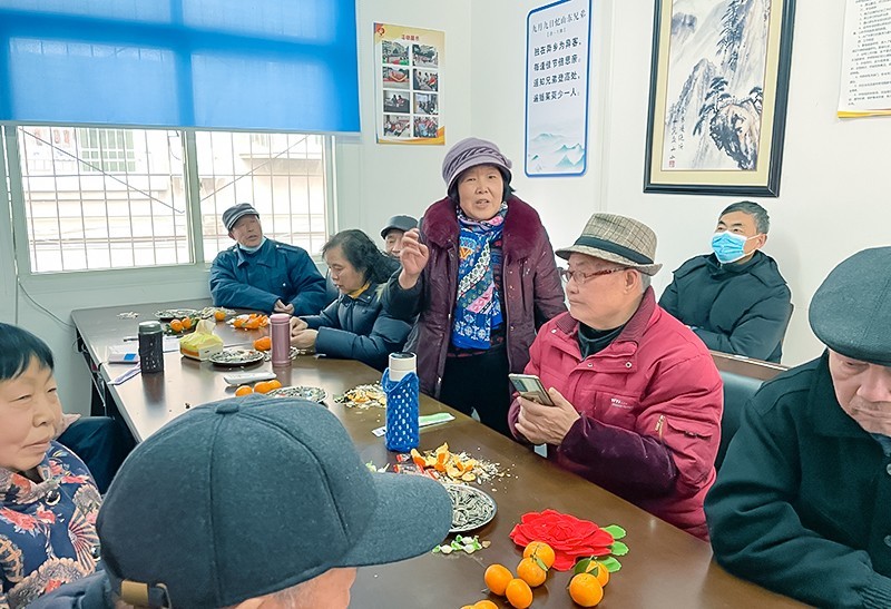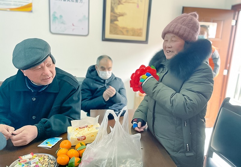 活动现场,大家围坐在一起,一边吃着水果、花生和瓜子,一边聊着天,在欢快的气氛中,破冰游戏击鼓传花开始啦。当花传到赵奶奶的手上时,老人家显得有点不知所措,在大家的起哄声中,她终于鼓起勇气站起来说了一句“新年快乐,多多发财”。