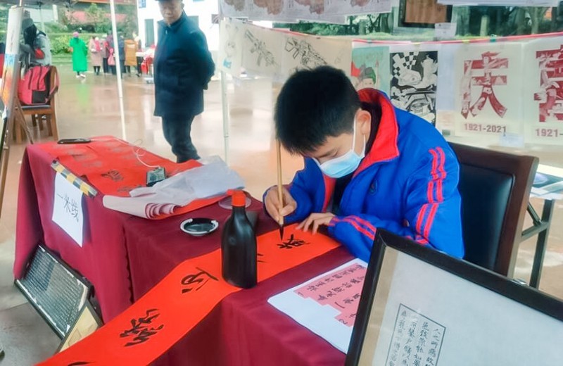 活动现场设置了红色文化作品展览区、手工区、红色游戏区以及红色服装体验区共计4个区域。在手工区展览处,一幅生动的手绘我国地图吸引了居民们围观,它用简易的木架横挂着,没有精致的外表装饰,却是孩子们一步一笔辛苦绘制而来。“从去年9月,我就开始思考如何依托红色基地,弘扬爱国精神。我发动了我的书法学生们进行创作,从开始观看红色电影、重走长征路,再到地图大比拼,最终运用硬笔书法绘制我国地图,让孩子们深入了解中国发展历程,也向居民们宣传党的百年历史。”居民刘义祥说。