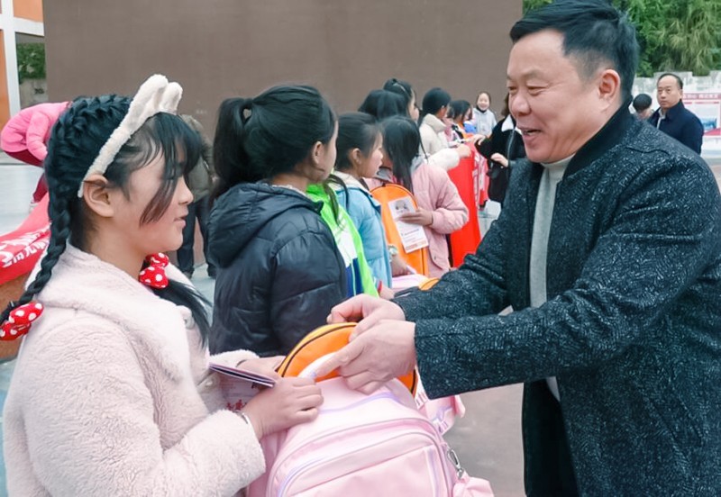 在黄溪小学教学楼前,民建高坪工商支部会员与孩子们亲切交流,询问她们的家庭生活状况,了解她们在学习、生活中遇到的问题和困难,鼓励她们努力学习、积极向上,并为孩子们送去精心准备的书包、文具、保温杯和羽毛球拍等价值3000余元的生活学习用品。