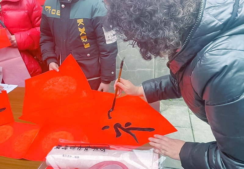 辛勤工作的社工们早已将笔墨纸砚准备就绪。孩子们认真观摩学习书法老师和家长的示范后,也有模有样挥毫泼墨起来。一个男孩一边书写,一边口中念念有词;有的家长“下笔如神”,或清新飘逸,或刚劲有力,满载着浓浓祝福和吉祥寓意。