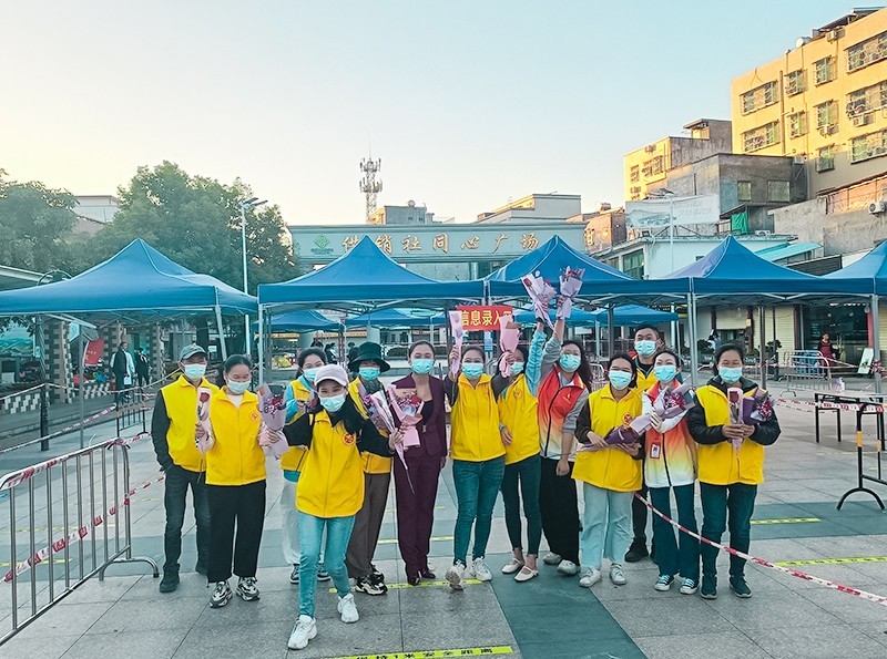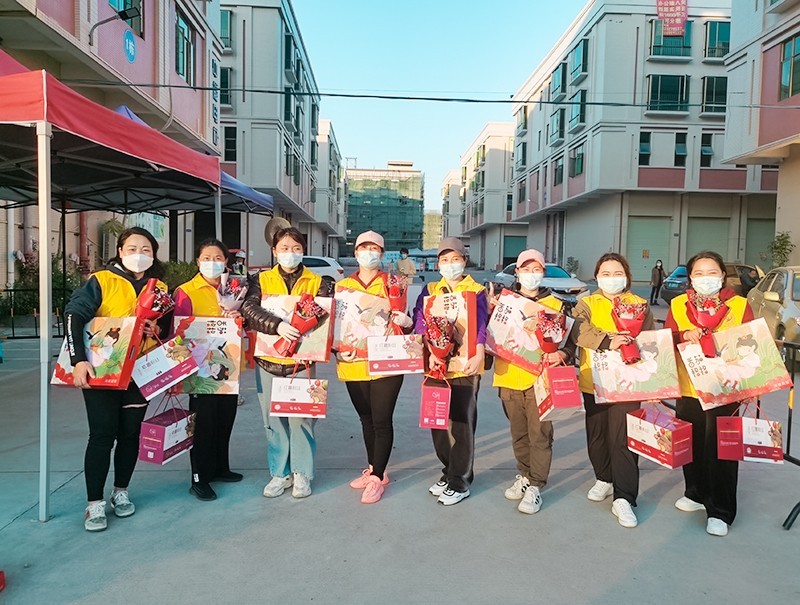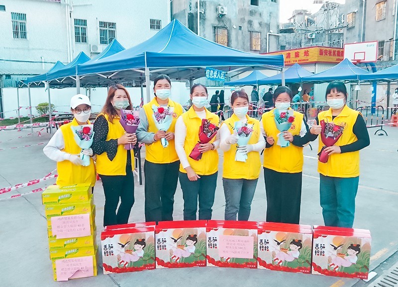 本次慰问中,广东薪城工程捐赠100箱圣女果,惠东鸿达贸易陈勇斌先生捐赠40箱金锣火腿肠,甘香农贸捐赠50箱番薯粉丝。当天,协会将爱心企业的心意一一送到大岭街道爱尚百货、新安社区、同心商业城、大岭鞋城核酸检测点的每一位女性志愿者手上,并献上了一束鲜花。在这个国际妇女节,抗疫一线的女性志愿者被满满的爱意与祝福包围。