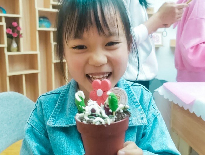 小朋友开始自己动手制作盆栽。