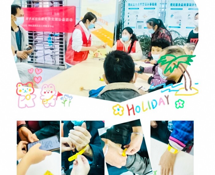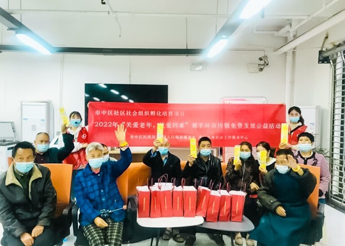 为帮助易走失老人安全回家,2022年内江灵犀社会工作服务中心“关爱老年,让爱回家”黄手环宣传暨免费发放公益活动在朝阳镇开始啦~