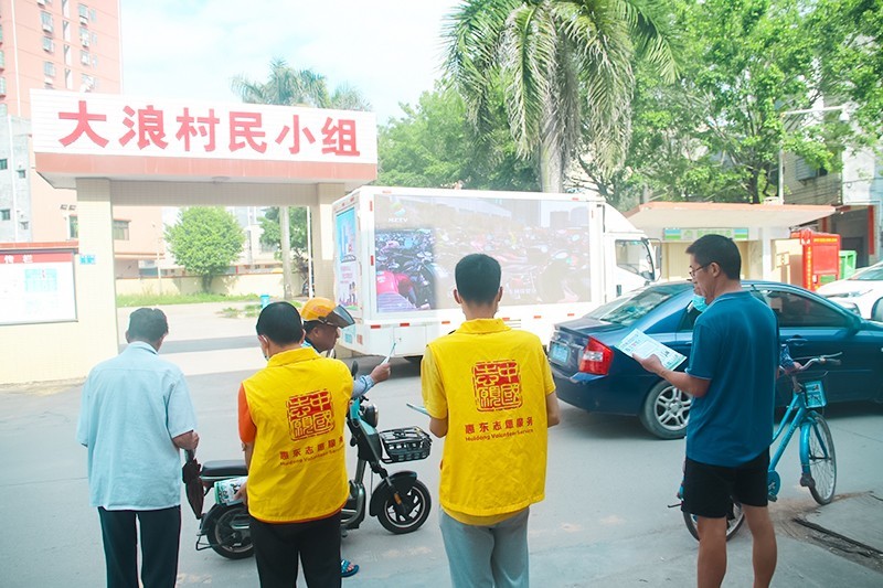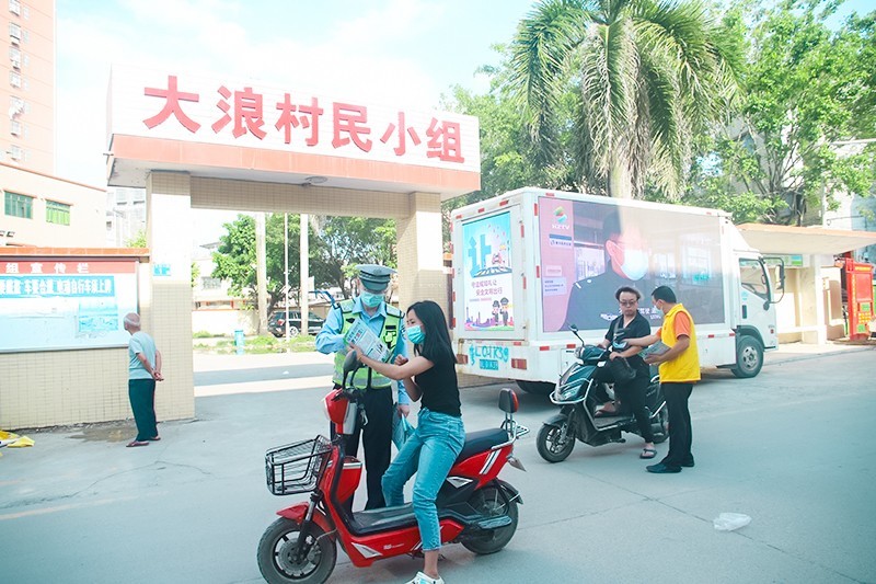 交警和志愿者以大浪村民小组为基点,向周边地区铺开宣传,以派发宣传资料、张贴宣传海报、LED宣传车巡游的形式,普及了《惠州市加强摩托车和电动自行车综合治理的十项措施》,耐心地解答群众提出的有关摩电驾驶的问题,让广大群众清楚地知道了政策实施的时间、电动自行车合标标准、上号牌流程等内容。活动中,还向骑乘摩托车、电动自行车的驾乘人员讲解摩电综合整治行动的意义和重要性,劝导教育市民驾乘摩电出行必须佩戴安全头盔、不闯红灯、不逆行等,提高交通安全意识,遵守交通规则,确保自身和他人安全。