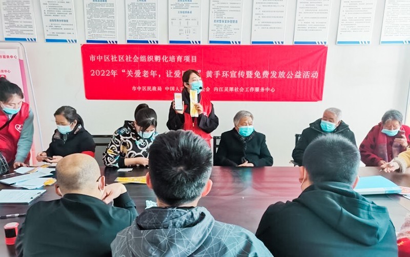 上午九点在内江市市中区全安镇全安社区开展了2022年“关爱老年,让爱回家”黄手环宣传暨免费发放公益活动,灵犀社工为在场的志愿者和老人们细致讲解了黄手环的功能、种类和使用方法,志愿者们也积极询问、动手操作为老人们申领黄手环,本次活动强化了志愿者们防止老人走失的意识,了解了老人走失后的应对方法。