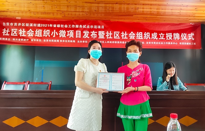 仪式上,筱溪街道党工委书记刘学渊刘书记分别为青杠林社区、向阳社区和金鱼河社区成立的社区社会组织颁发了《自贡市贡井区社区社会组织备案证书》。筱溪街道社工站社工向居民们发布了相关小微项目进行讲解,开展了社区社会组织培训会。