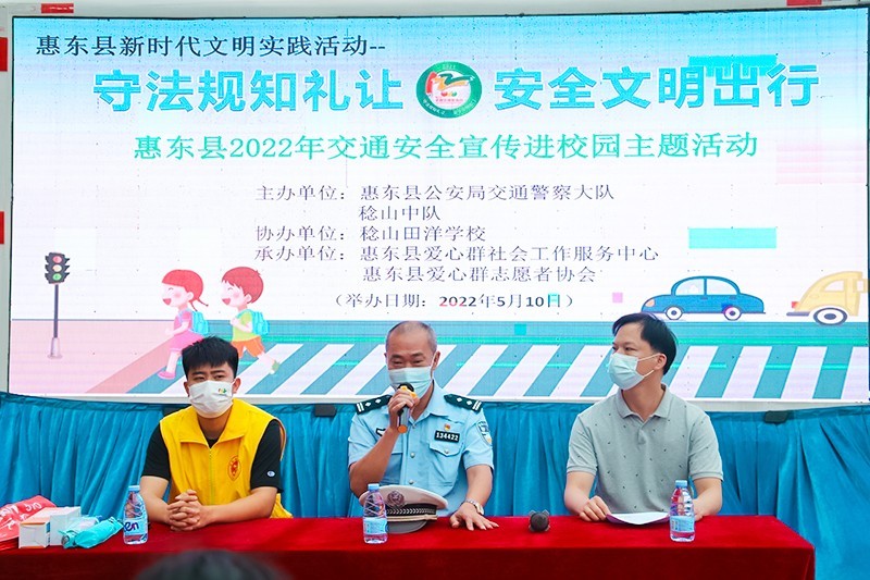 5月10日,由广东省惠东县公安局交警大队、稔山中队主办,稔山田洋学校协办,惠东县爱心群社会工作服务中心、惠东县爱心群志愿者协会承办的“守法规知礼让·安全文明出行”惠东县2022年交通安全宣传进校园主题活动在稔山田洋学校开展。