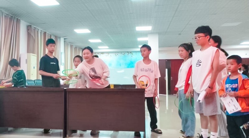 伴随着小朋友们的欢呼声,现场气氛很快升至最高,本次活动共分为团体活动和游园会两部分,团体活动有三——《越线取物》、《投壶 》、《“小积木,大创意”乐高搭建》,要求所有同学以自行组队的方式参加,再以小组为单位展开竞赛,每场活动最先完成小组获得奖励。游园会共设有《投壶游戏》、《套圈》、《你演我猜》、《秒接对联或歇后语》四个摊位,由志愿者作为“摊主”“打理”摊位,邀请孩子们完成摊位任务,每完成一个任务可获得一个印章,收集3个奖章即可在兑奖处兑换奖品。虽然为自愿式参与,但30余名普教儿童均积极参与,从一开始的手忙脚乱到后来的齐心协力,相互配合,玩得不亦乐乎,会议室中回荡着一片欢声笑语……