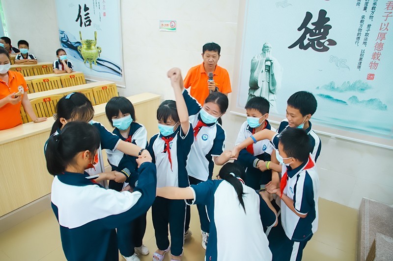 活动现场以分组挑战的形式进行“童心协力”团队合作能力历奇活动。各参赛队伍在“牵手连环”“共同进退”“人力水车”“纸不落地”“坐地而起”五个考验协作能力的历奇任务中团结一心,凭着有效的沟通、充分的信任出色的完成任务,进而提升自信心,锻炼沟通交流和解决困难的思维能力。在社工的引导下,学生们分析回顾了整个历奇过程,让孩子们意识到团结合作的重要性、如何在团结协作中解决问题。