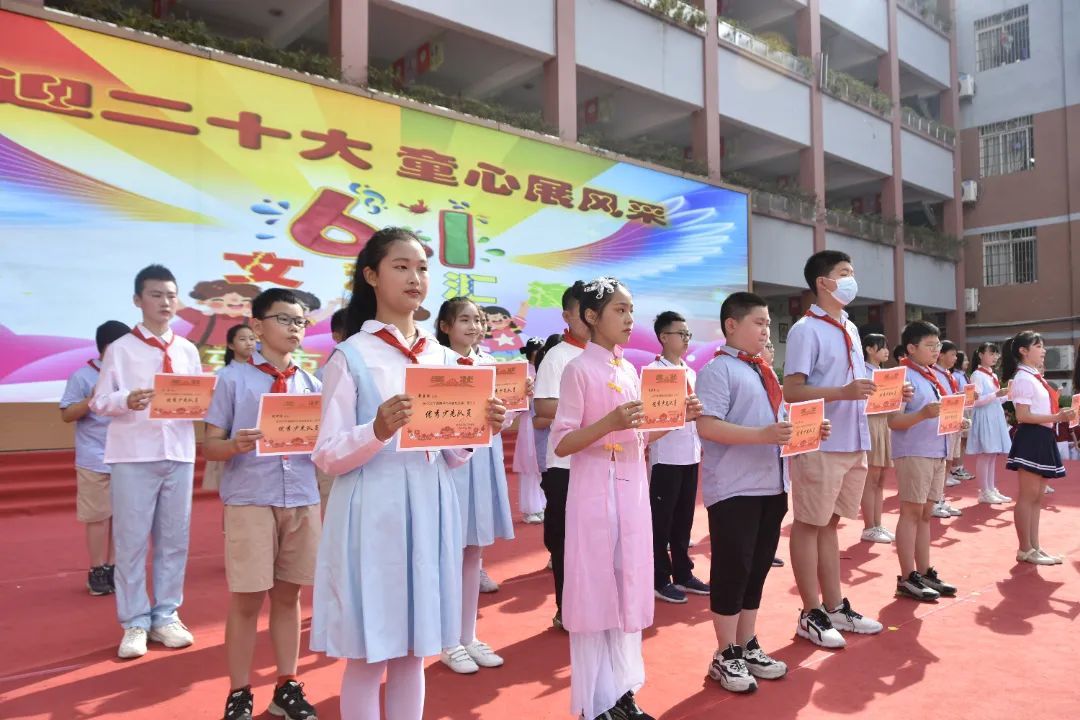 接着,各年级负责领导宣布优秀少先队员名单和优秀班集体名单,并颁发奖状,在鲜红的队旗下,在红领巾的映衬下,在奖状证书的光辉里,孩子们的脸熠熠生辉,一种神圣的喜悦洋溢在孩子们的心胸,多么幸福的时刻啊!