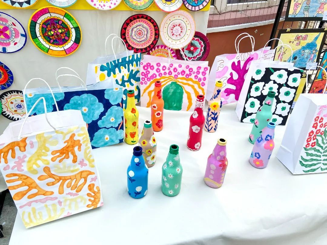 为了体现环保、再利用意识在老师以及同学们积极动手下,我们将平时学习的美术知识运用了起来。废酒瓶变成了美丽的花瓶,纸袋摇身一变穿上了美丽的花衣裳!
