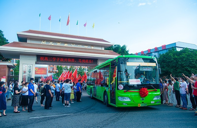“高考加油,高考必胜!”在该校校长易延发的阵阵加油声中,同学们纷纷登上“高考专用车”。7点58分,送考车在警车开道下一辆辆徐徐驶出了学校,承载着老师与家长的期盼,南充十一中学子们意气风发地向考点进发。