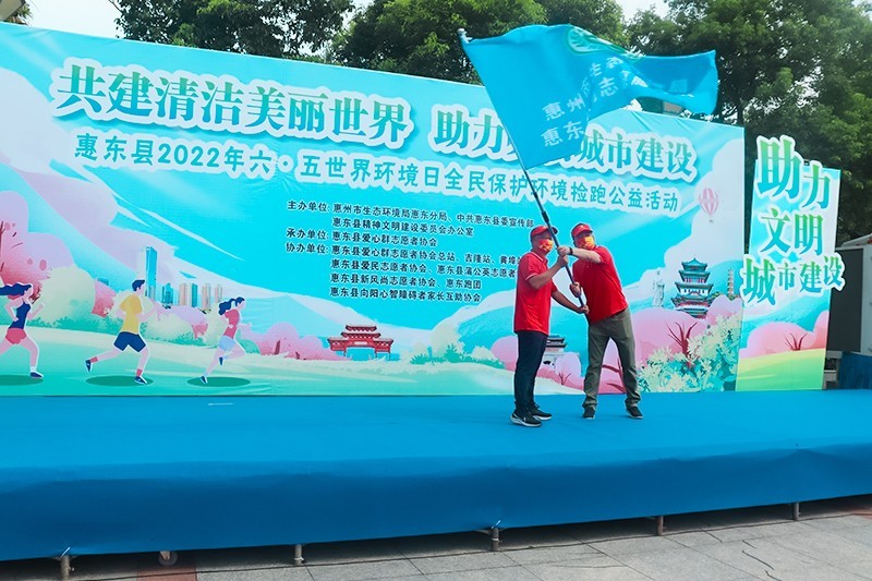 活动期间,还举行了惠东县生态环境局捡跑志愿服务队授旗仪式,惠东县捡跑志愿服务队代表发起“共建清洁美丽世界 助力文明城市建设”倡议。
