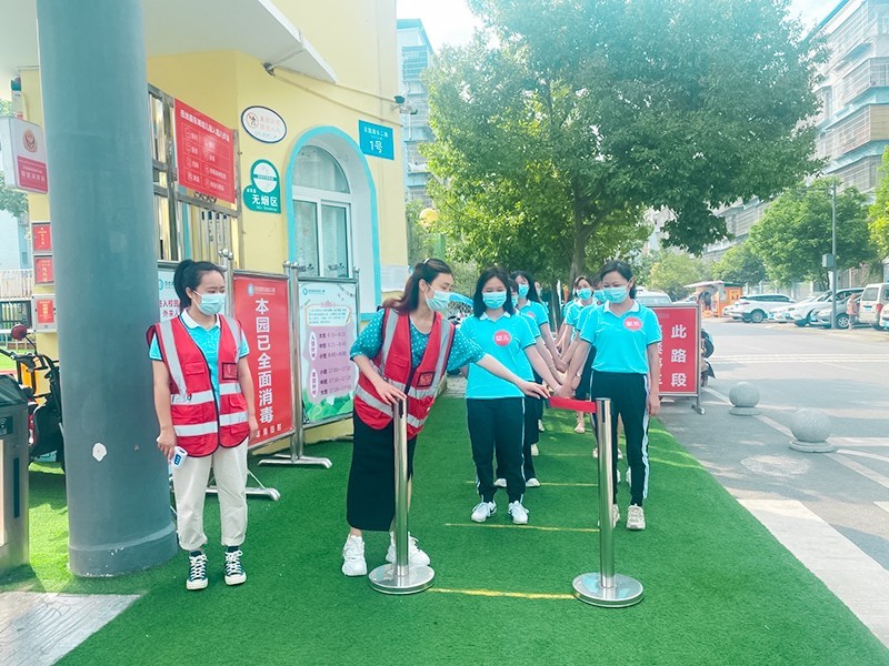 幼儿入园环节,教职工扮演家长和幼儿,家长带幼儿到大门外严格按照幼儿园规定的位置和时间分批、错时、排队入园,入园前佩戴口罩,排队时保持1米的安全距离。孩子们有序排队入园,在指定区域测温、消毒和检查。