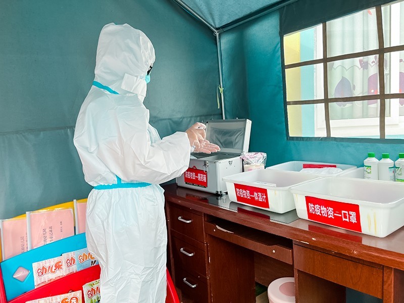 教学活动中发现有幼儿出现咳嗽、呕吐的现象,教师马上为幼儿测量体温,发现幼儿体温异常,老师就马上规范为幼儿佩戴好口罩,护送幼儿到隔离室。保健老师对发热幼儿复核体温,与家长取得联系询问核对临床症状及接触史。园领导马上向疾控中心汇报情况,安全防控后勤组庚即做好幼儿园安全防控工作,消毒组人员穿上防护服对疑似幼儿活动过的区域、使用过的物品进行全面消毒清洁。整个演练活动中,所有参演人员严阵以待,按既定预案,行动迅速,配合密切,各环节衔接紧密,紧张有序,演练达到预期效果。