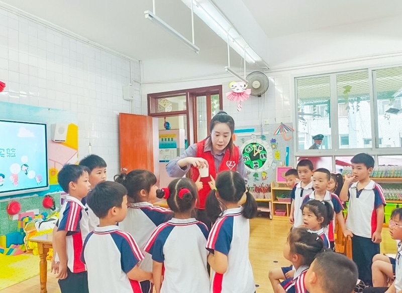 在“感温贴科学小实验”环节,志愿者举起水杯,教孩子们通过感温贴的变化来判断物品是否处于高温,当热水倒进杯子里,感温贴由黑变红时,孩子们发出一阵阵惊叹声,并惊呼:“呀,怪兽来了,快跑呀!”