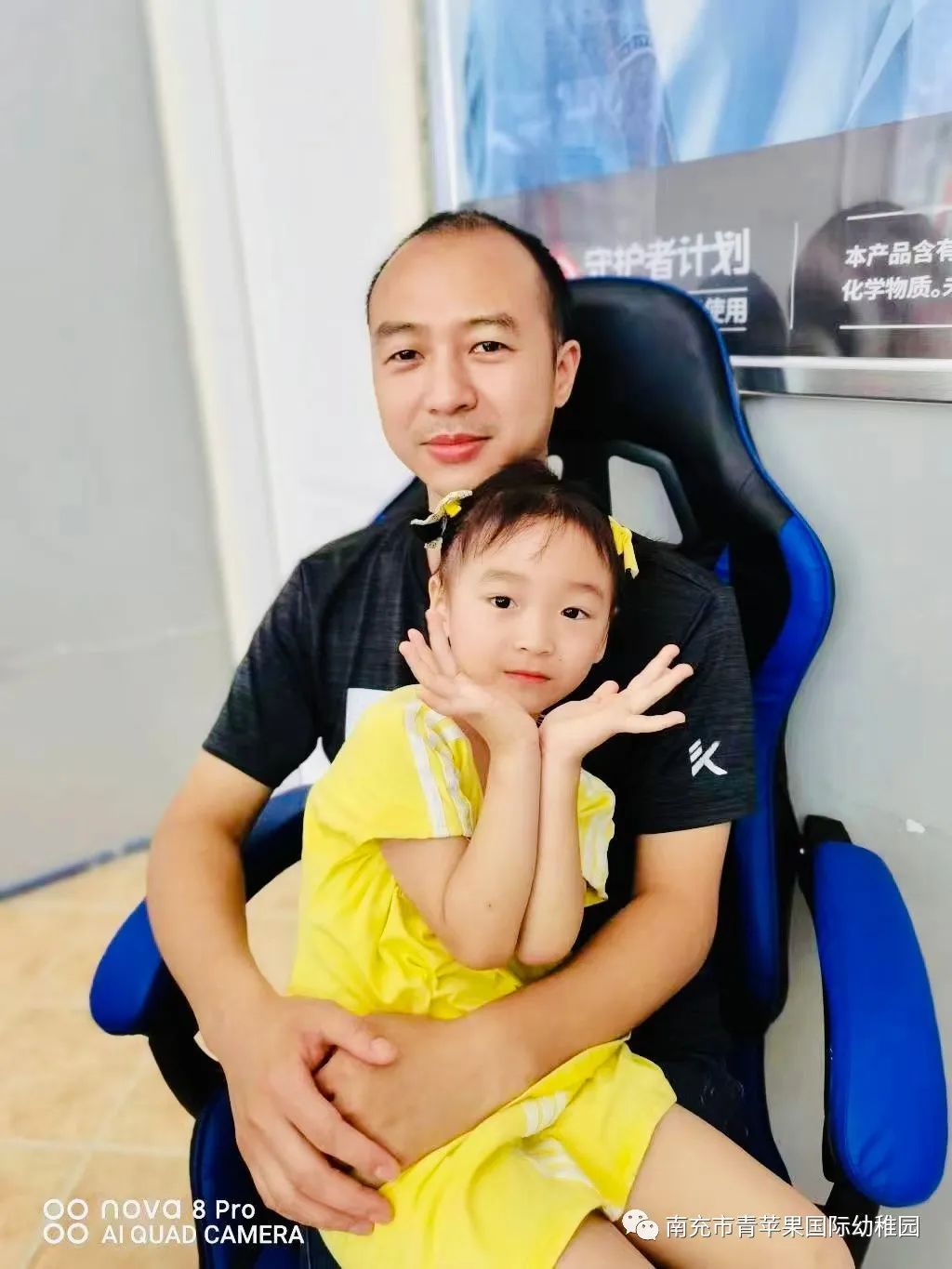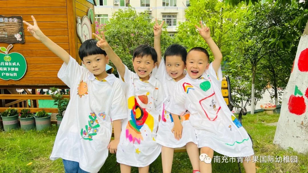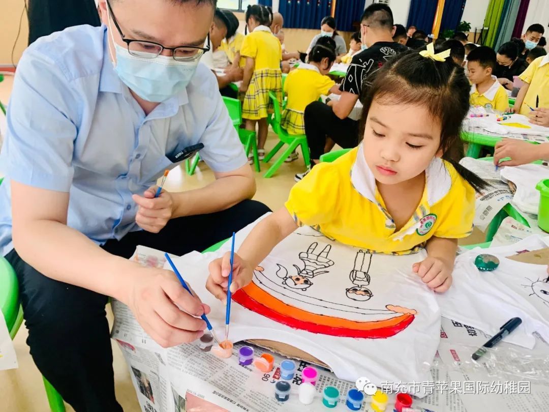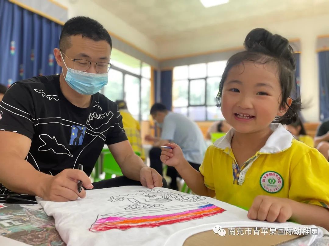 南充市青苹果国际幼稚园里,父亲节收到最酷的礼物就是宝贝们和爸爸一起DIY的T恤衫。