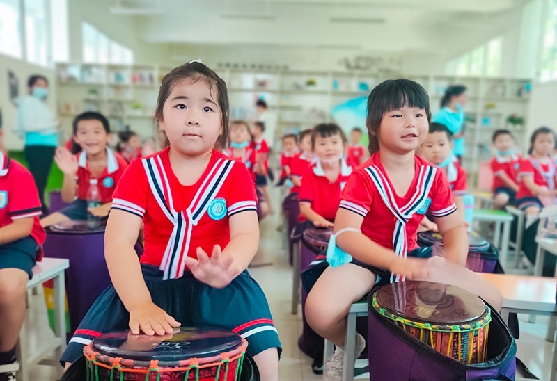 之后,孩子们在小学老师的带领下参观了校园,观看了特色课堂展示,参观了国画鉴赏馆与阅览室,体验了非洲鼓。原来小学的生活是这么的丰富多彩呢!为了有更深刻的小学课堂体验,孩子们走进了向往已久的小学教室,佩戴上了红领巾,坐在了哥哥姐姐的板凳上,学着哥哥姐姐的样子,坐姿端正、认真听着老师们讲解着幼儿园与小学的不同,既兴奋又激动,仿佛这一刻自己就是一名小学生。