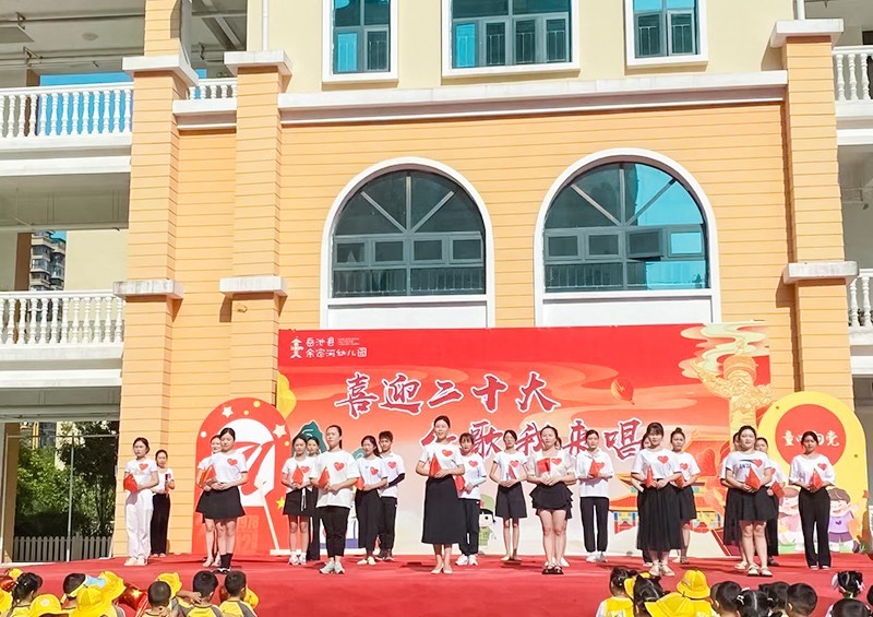 本次活动由余家河幼儿园老师们表演的舞蹈《灯火里的中国》拉开序幕。一首歌,记录一段岁月,象征一面旗帜。随后,老师们合唱歌曲《我和我的祖国》,铿锵有力的嗓音回荡在幼儿园的每个角落。